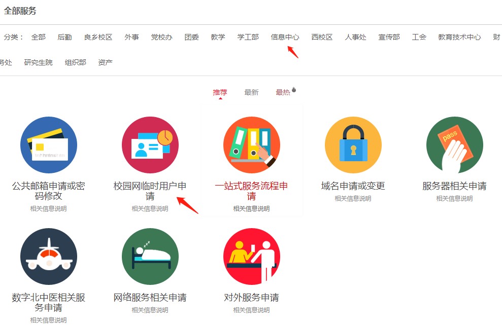 2.进入“一站式服务大厅”,在分类中选择“信息中心”,并在“信息中心”分类下选择“校园网临时用户申请”。