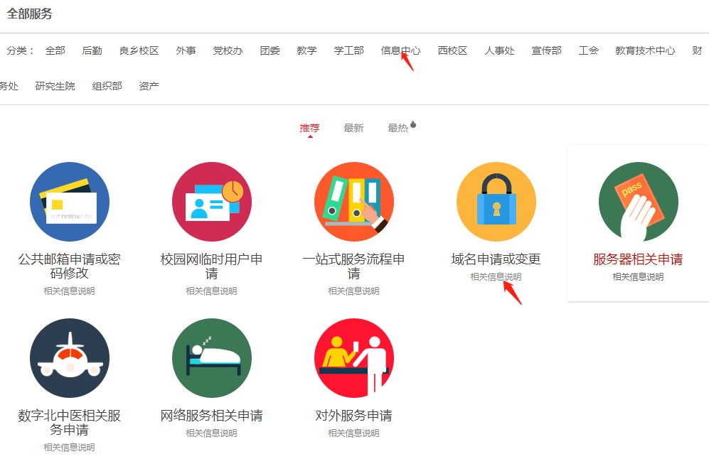 2.进入“一站式服务大厅”,在分类中选择“信息中心”,并在“信息中心”分类下选择“域名申请或变更”。