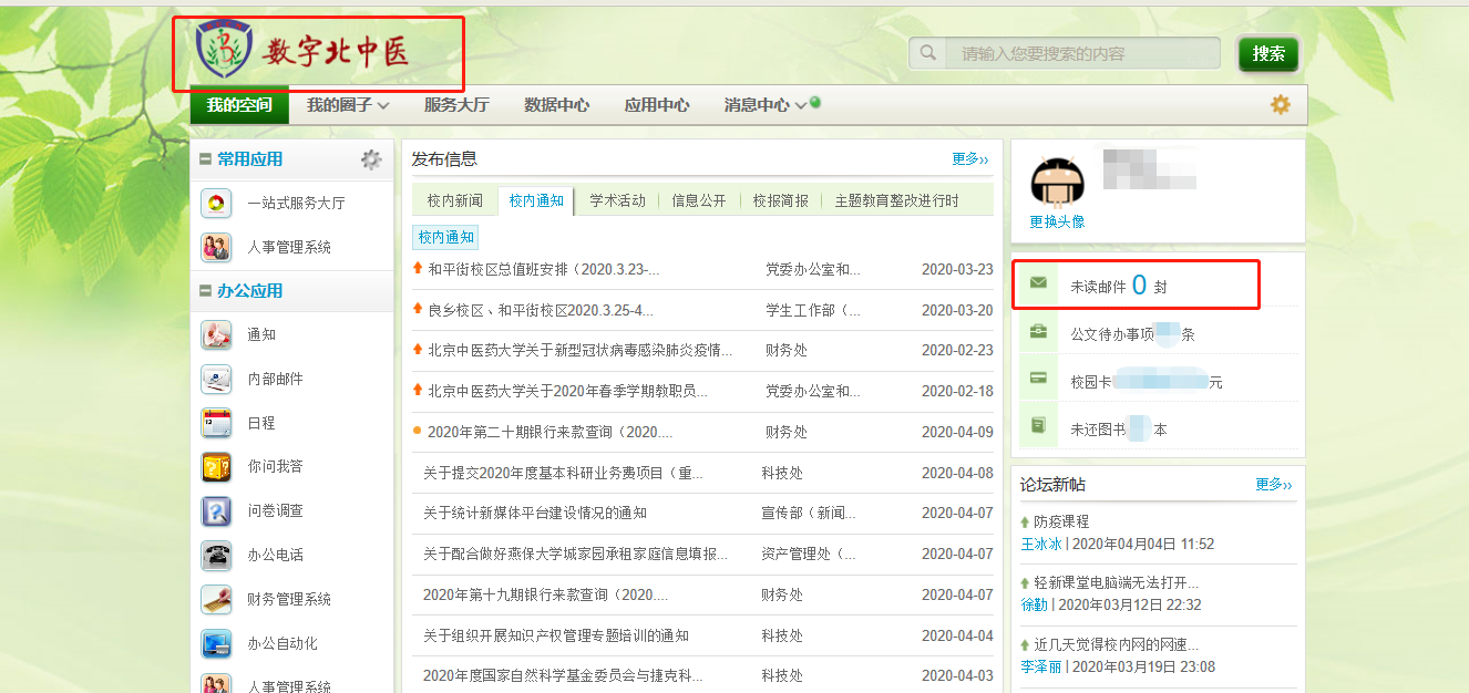 1.用户通过登录数字北中医,点击“未读邮件”进入邮箱界面