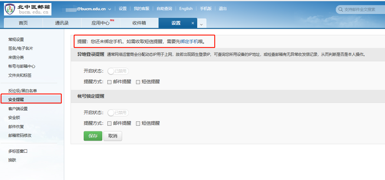 3       .点击“安全提醒”,完成手机绑定