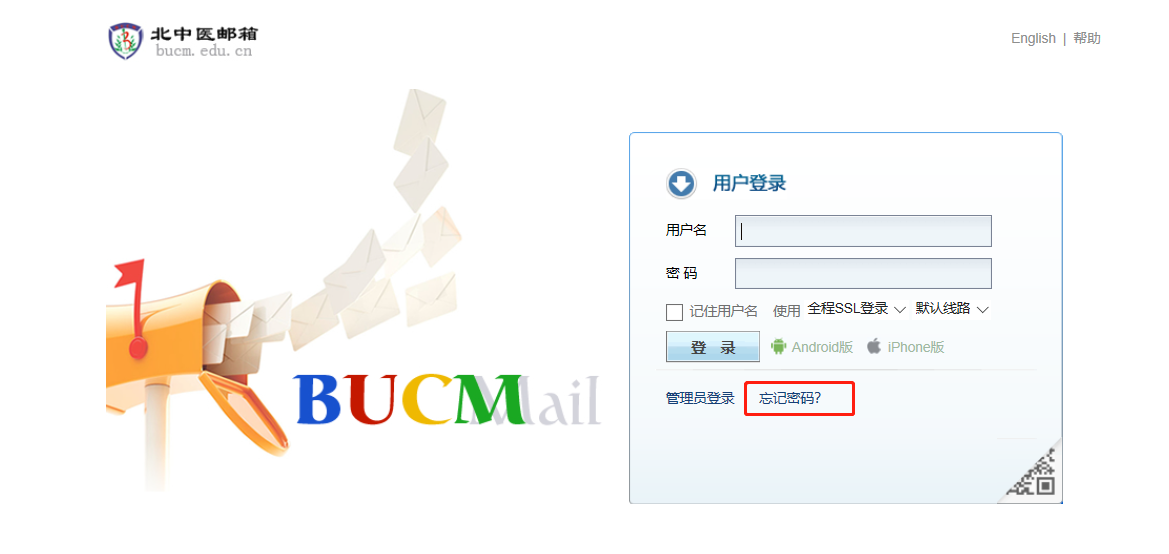 4.打开网页,输入网址http://mail.bucm.edu.cn/,进入北中医邮箱登录界面,点击“忘记密码”