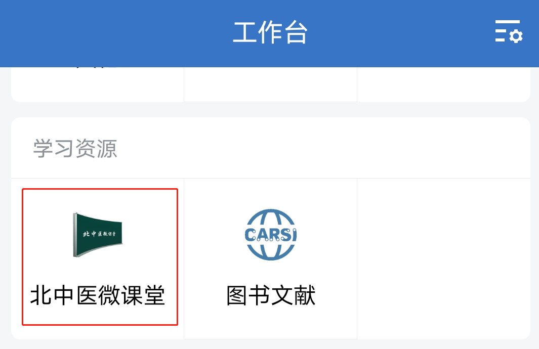 手机端可打开“企业微信”,点击“工作台”,找到“北中医微课堂”应用点击进入,如下图: