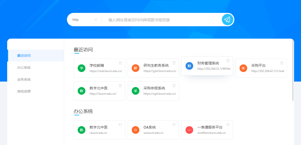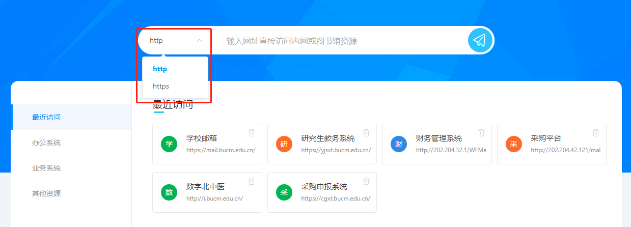 4.如果“常用站点”中没有所需的资源,可在页面上出现的地址栏中输入需访问的网址(注意左侧下拉列表可选择所需的连接方式),然后点击“立即跳转”即可。支持http、https协议。