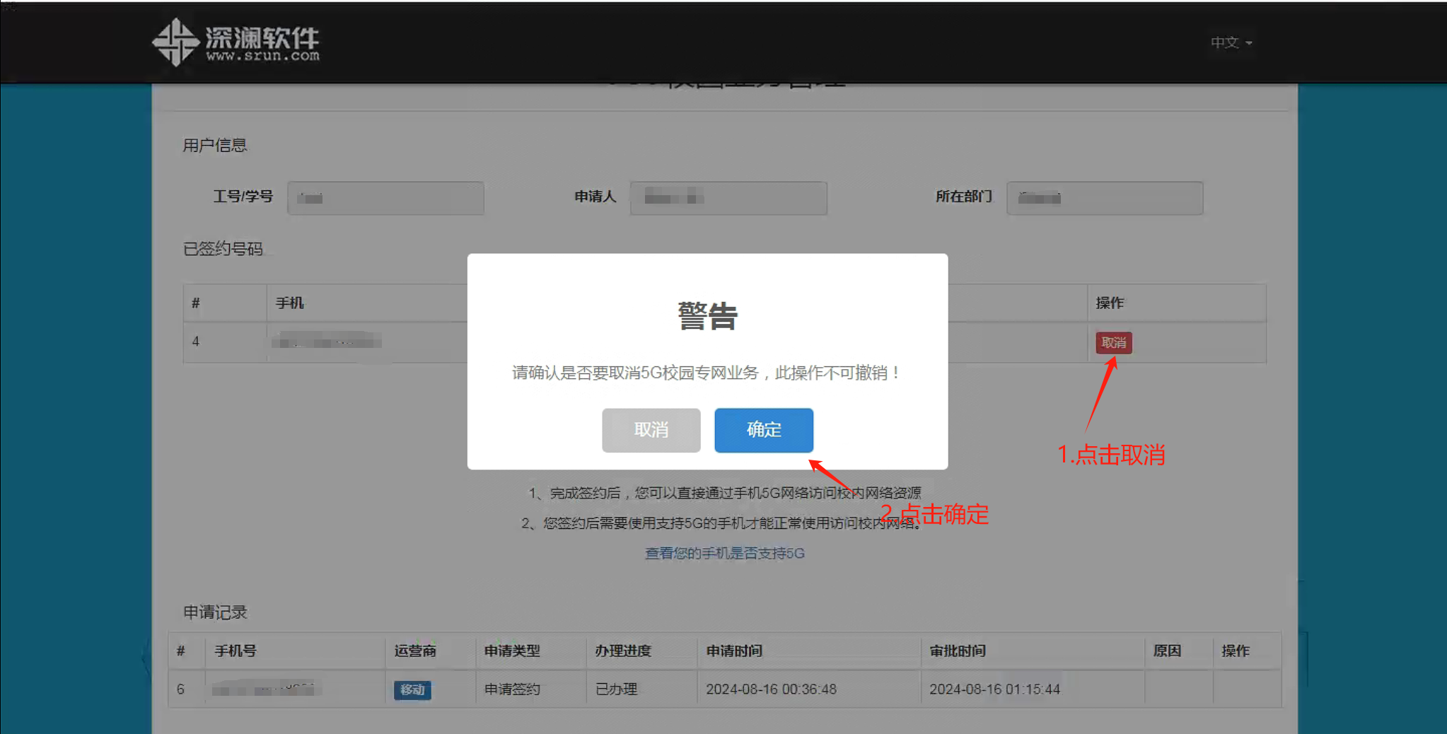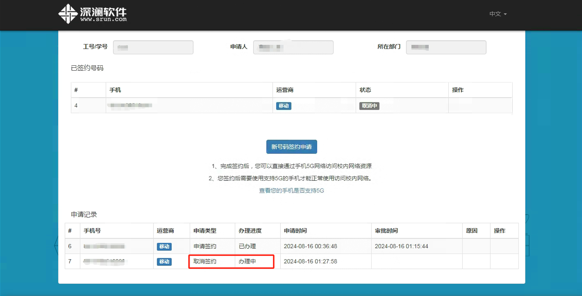 平台审核用户信息,审核通过后,将开通5G双域校园专网业务。登录平台可查看开通结果及办理失败原因,办理结果也会以短信方式通知用户;取消5G双域校园专网业务,可登录平台进入5G签约页面,点击取消。平台审核通过后业务将被取消,并于次月生效(注:月末最后两天暂停办理)。