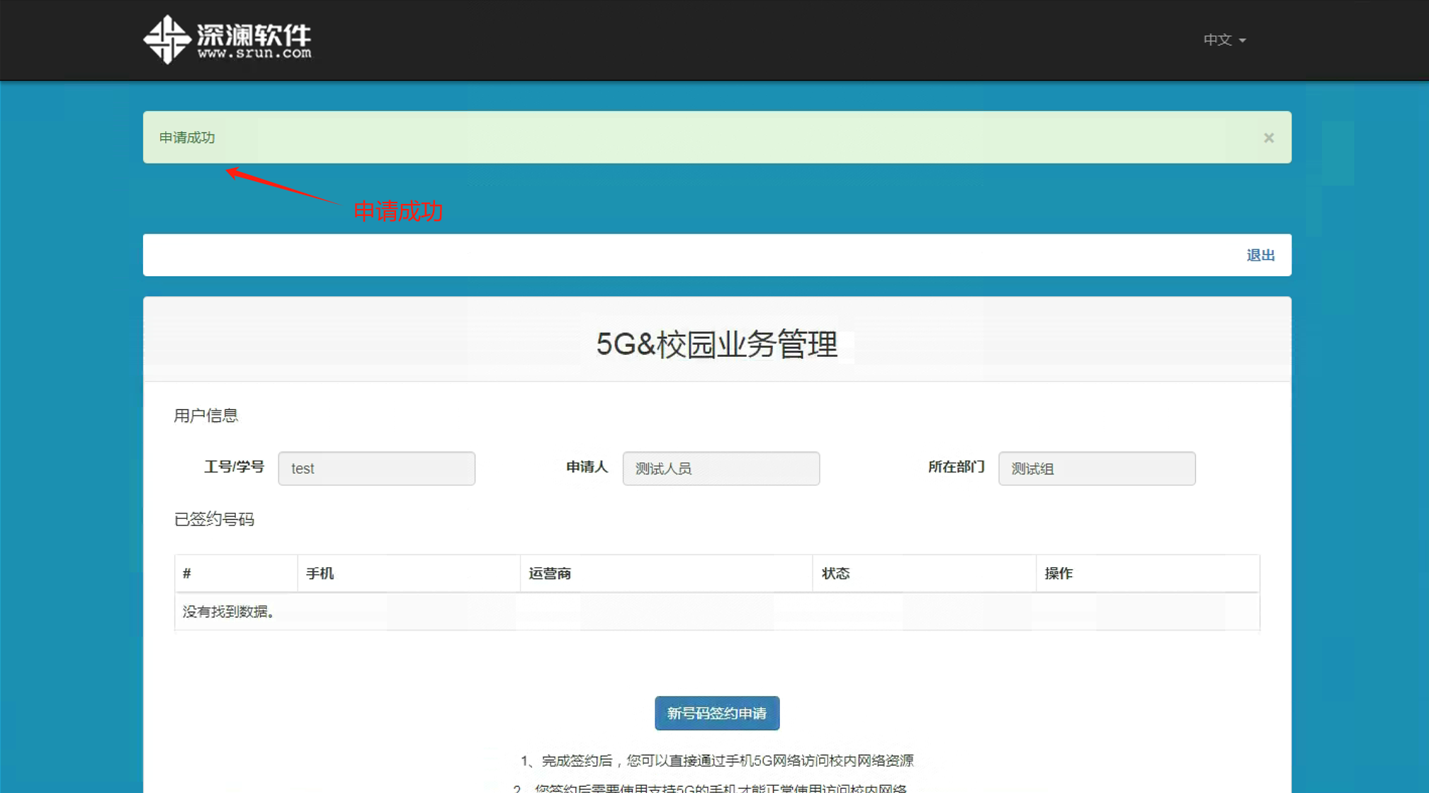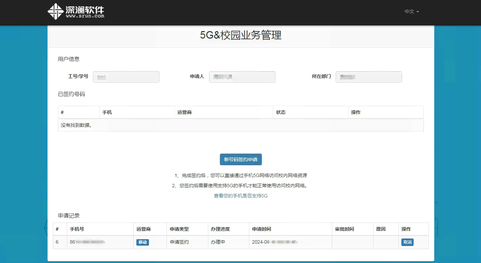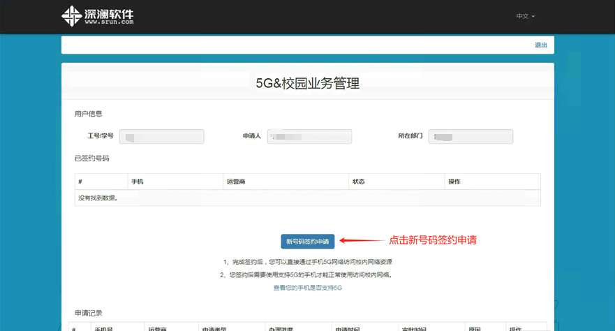 登录数字北中医,在左侧“办公应用”下点击“5G双域专网平台”按钮,进入到签约申请页面,点击新号码签约申请。